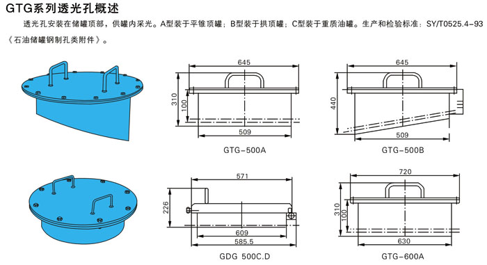 裝于油罐頂部,供罐內(nèi)采光用,A型裝于平錐項(xiàng) 罐,8型裝于拱項(xiàng)油罐,C型裝于重質(zhì)油罐,本產(chǎn)品不帶加強(qiáng)板。