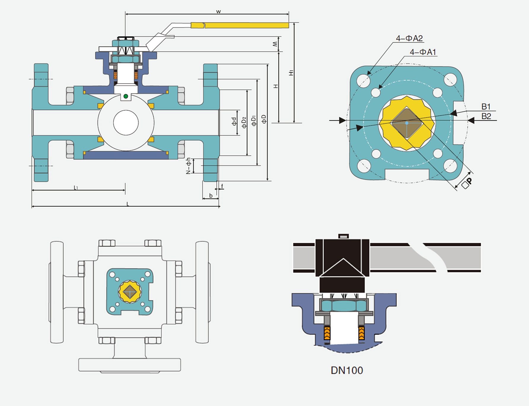 公稱通徑 DN(mm) | L | L1 | D | D1 | D2 | D6 | b | f | f1 | N-Φh | W | M | H | H1 | P | ΦA1 | ΦA2 | B1 | B2 |