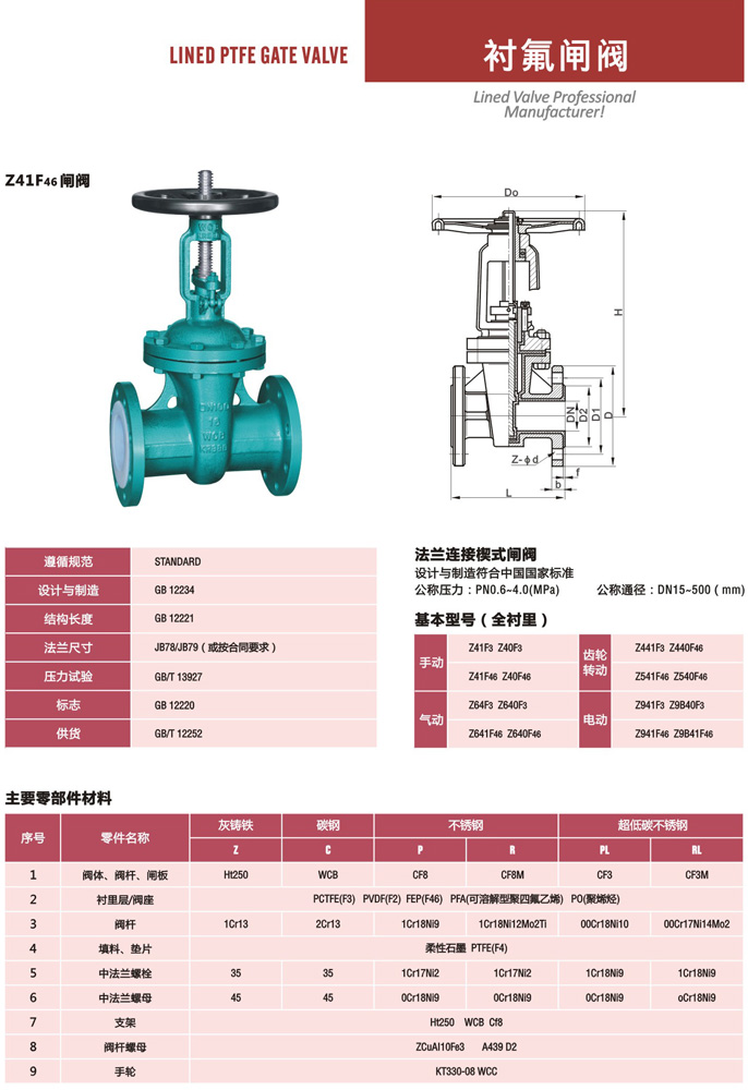1、閥體、閥蓋的內(nèi)腔和閘板、閥桿外表面等直接與介質(zhì)接觸的部件,全部名襯FEP(F46)等氟塑料;