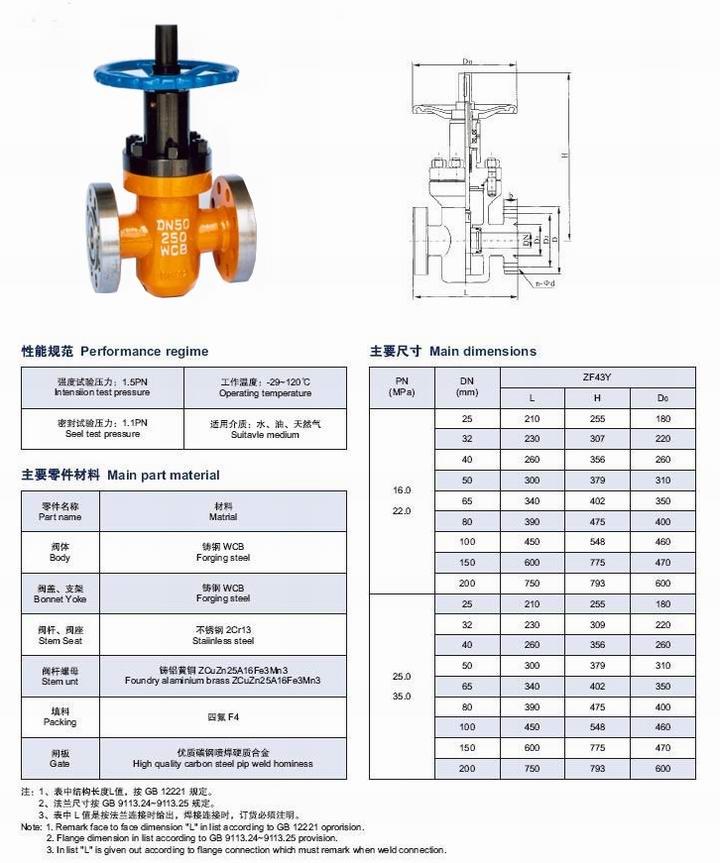 產(chǎn)品型號:ZF43Y、ZF63Y、Z83Y、ZF543Y、ZF563Y、Z583Y、KZ53Y公稱通徑:DN25-DN300公稱壓力:16Mpa-42Mpa適用溫度:-30℃-125℃適用介質(zhì):水、油品、天然氣等閥體材質(zhì):鑄鋼、碳鋼、不銹鋼連接方式:法蘭連接傳動方式:手動,蝸輪設(shè)計(jì)標(biāo)準(zhǔn):GB/T19672;API 6D結(jié)構(gòu)長度:GB/T 19672;API 6D連接法蘭:GB/T 9113;ASME B16.5試驗(yàn)檢驗(yàn):JB/T 9092;AIP 598