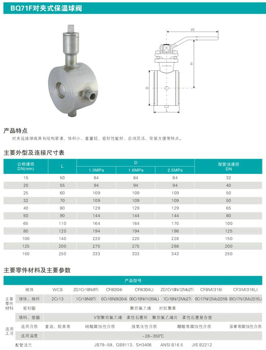對夾式保溫球閥,BQ71F保溫球閥主要技術參數:
