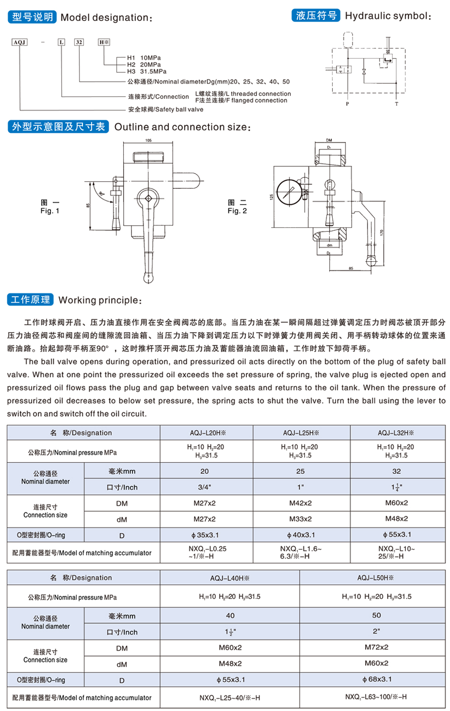 安全球閥,AJF,AQJ,安全球閥是在(原AQF型安全球閥的基礎(chǔ)上設(shè)計),用于液壓系統(tǒng)中起著蓄能器的安全、斷流、卸荷的。液壓配套元件已廣泛應(yīng)用于石油、化工、冶金、機械等行業(yè),深受用戶歡迎,使用壽命長,主要零部件材料具有抗腐耐磨性能。流通能力好、響應(yīng)速度快,可提高系統(tǒng)工作效率。該球閥其特點:外形體積小,表面鍍鉻光亮。
