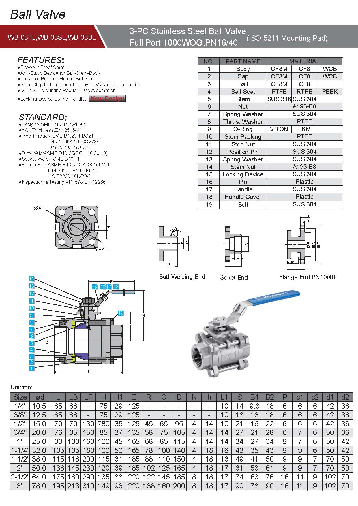 三片式球閥閥體鑄造,結(jié)構(gòu)合理、造型美觀。閥座采用彈性密封結(jié)構(gòu),密封可靠,啟閉輕松。 閥桿采用有倒密封的下裝式結(jié)構(gòu),閥腔異常升壓時(shí),閥桿不會(huì)被沖出。二片式、三片式球閥連接形式另有對(duì)焊(BW)承插焊(SW),并均可帶標(biāo)準(zhǔn)ISO支架平臺(tái)和鎖定裝置?稍O(shè)置90°開(kāi)關(guān)定位機(jī)構(gòu),根據(jù)需要加鎖以防止誤操作,驅(qū)動(dòng)方式:手動(dòng)、電動(dòng)、氣動(dòng)。