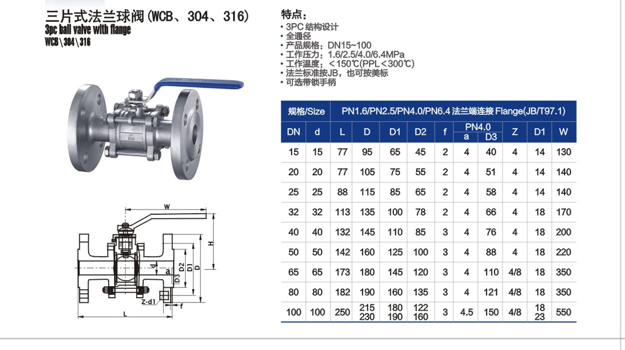 三片式法蘭球閥適用介質(zhì):水、油、氣及某些腐蝕性液體(W.O.G)用穩(wěn)定范圍:-20~232℃~350℃公稱壓力:1.6-4.0MPa