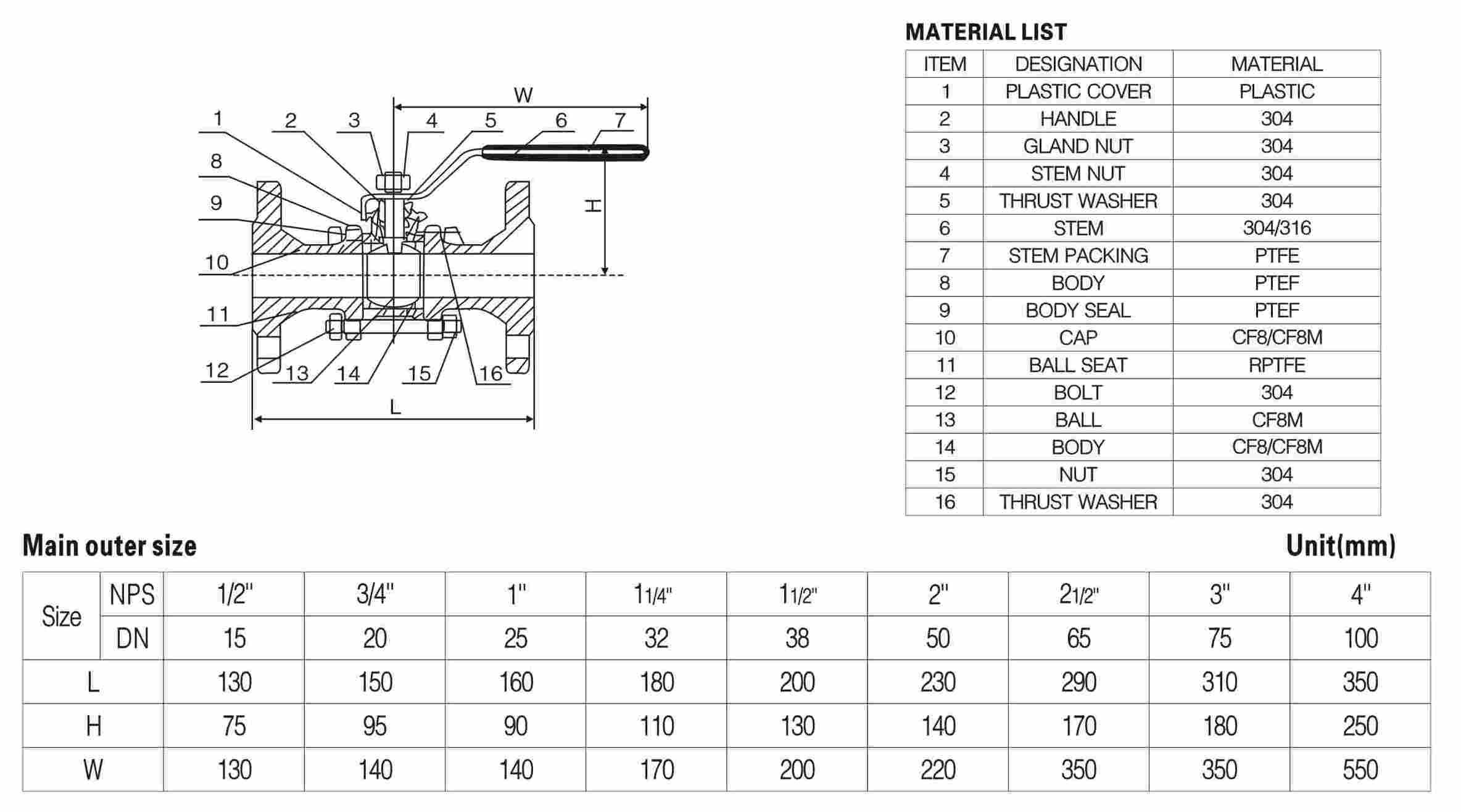 三片式法蘭球閥主要尺寸 單位:mm