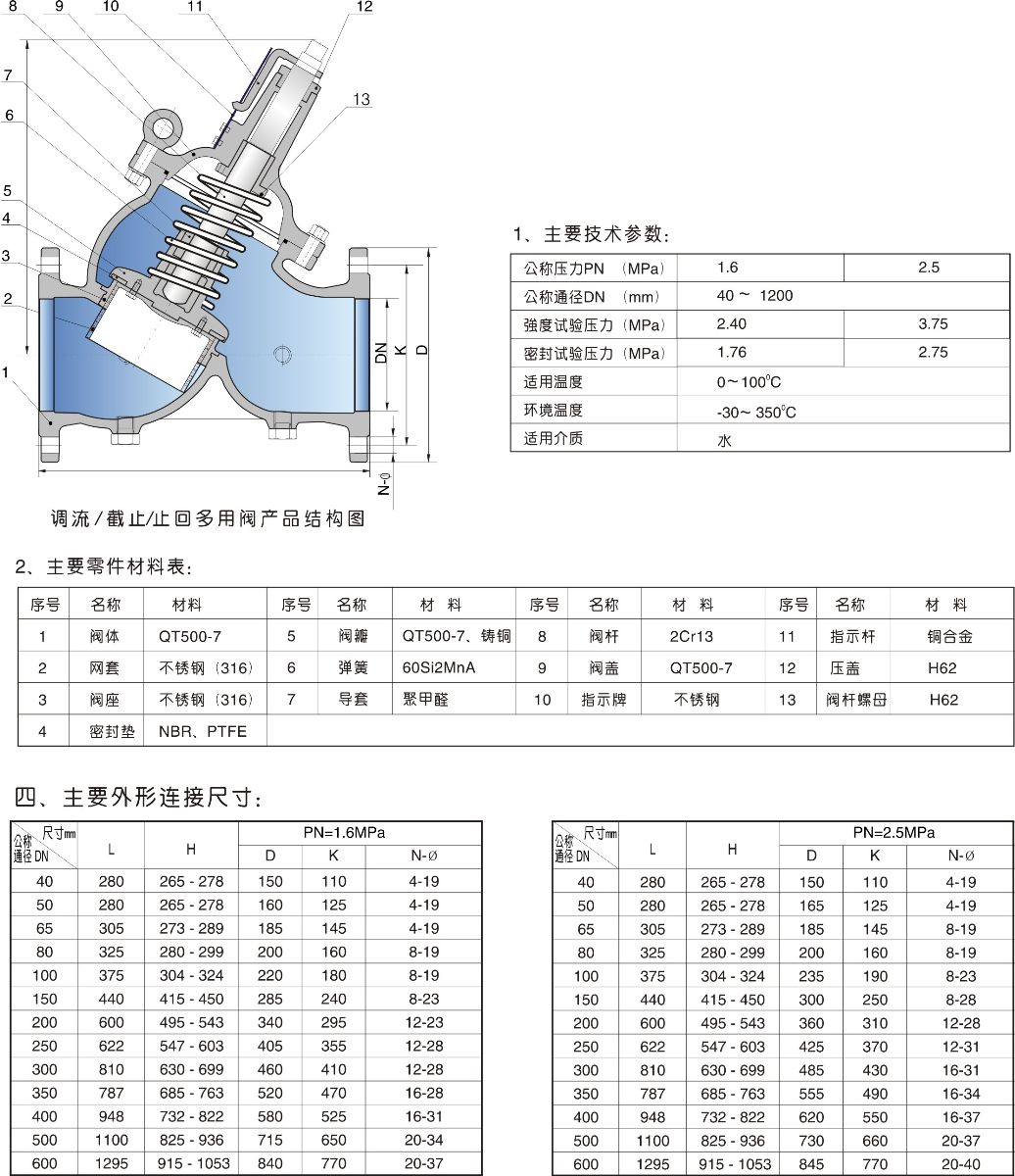JLH型多功能三合一止回閥它包括閥體內(nèi)設(shè)閥座、閥桿、彈簧、閥瓣、導(dǎo)套等零件組成。此閥具有截至、止回、節(jié)流三種功能。主要用于水泵出口或其它防止液體倒流的管道,可有效的防止普通止回閥液體倒流時(shí)產(chǎn)生的水錘沖擊和噪音,是止回閥的更新?lián)Q代產(chǎn)品。 安裝了加速關(guān)閉彈簧,利用快關(guān)原理防止水錘的產(chǎn)生,防止介質(zhì)倒流,達(dá)到靜音關(guān)閉;裝有開度指示器,通過調(diào)節(jié)開度,可以調(diào)節(jié)水泵的輸出量;關(guān)閉閥桿,可起到截止閥的作用。